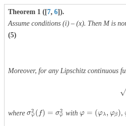 \[ \begin{array}{r@{\hskip0pt}l}\displaystyle \xi (Y,\varDelta ,W)& \displaystyle =\frac{\varDelta \cdot \varphi _{\lambda }(Y)}{\lambda _{0}(Y)}-\frac{\exp ({\beta _{0}^{\top }}W)}{M_{U}(\beta _{0})}{\int _{0}^{Y}}\varphi _{\lambda }(u)du+\varDelta \cdot {\varphi _{\beta }^{\top }}W\\{} & \displaystyle \hspace{1em}-{\varphi _{\beta }^{\top }}\frac{M_{U}(\beta _{0})W-\mathsf{E}[U{e}^{{\beta _{0}^{\top }}U}]}{M_{U}{(\beta _{0})}^{2}}\exp \big({\beta _{0}^{\top }}W\big){\int _{0}^{Y}}\lambda _{0}(u)du,\end{array}\]Theorem 1 ([7, 6]).