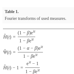 | $\widehat{\Psi }(t)=\displaystyle\frac{(1-\alpha -\beta ){\mathrm{e}^{\mathrm{i}t}}}{1-\beta {\mathrm{e}^{\mathrm{i}t}}}$ | ${\widehat{A}_{2}}(t)=-\displaystyle\frac{\beta (1-\beta )}{{(1+\gamma -\beta )^{2}}}(\widehat{H}(t)-1)(\widehat{\Psi }(t)-1)$ |