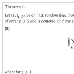 \[ {\bigg\| \sum \limits_{\boldsymbol{i}\in {\mathbb{Z}^{d}}}{a_{\boldsymbol{i}}}{X_{\boldsymbol{i},j}}\bigg\| }_{p}\leqslant \sum \limits_{K\subset [d]}{\bigg\| \sum \limits_{\boldsymbol{v}\in {E_{K}}}\sum \limits_{\boldsymbol{i}\in {A_{\boldsymbol{v}}}}{a_{\boldsymbol{i}}}{X_{\boldsymbol{i},j}}\bigg\| }_{p}.\]Observe that the random variable ${\sum _{\boldsymbol{i}\in {A_{\boldsymbol{v}}}}}{a_{\boldsymbol{i}}}{X_{\boldsymbol{i},j}}$ is measurable with respect of the σ-algebra generated by ${\varepsilon _{\boldsymbol{u}}}$, where $\boldsymbol{u}$ satisfies $(2j+2){v_{q}}-(j+1)\leqslant {u_{q}}\leqslant j+1+(2j+2)({v_{q}}+1)-1$ for all $q\in [d]$. Since the family $\{{\varepsilon _{\boldsymbol{u}}},\boldsymbol{u}\in {\mathbb{Z}^{d}}\}$ is independent, the family $\{{\sum _{\boldsymbol{i}\in {A_{\boldsymbol{v}}}}}{a_{\boldsymbol{i}}}{X_{\boldsymbol{i},j}},\boldsymbol{v}\in {E_{K}}\}$ is independent for each fixed $K\subset [d]$. Using inequality (3), it thus follows that