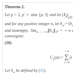 \[ {\big(\| {S_{n}}{\| _{2}}-{\big\| {S_{n}}-{S_{n}^{(m)}}\big\| }_{2}\big)^{-{p^{\prime }}}}\leqslant {\big(\| {S_{n}}{\| _{2}}-29{(\log 2)^{-1}}{m^{-\alpha }}\| {b_{n}}{\| _{{\ell ^{2}}}}{C_{2}}(\alpha )\big)^{-{p^{\prime }}}}.\](70)