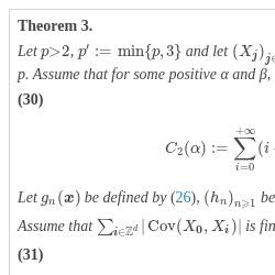 \[ {\varepsilon _{n}}:=\sum \limits_{\boldsymbol{j}\in {\mathbb{Z}^{d}}}\big|\mathbb{E}[{X_{\mathbf{0}}}{X_{\boldsymbol{j}}}]\big|\bigg(\sum \limits_{\boldsymbol{i}\in {\varLambda _{n}}\cap ({\varLambda _{n}}-\boldsymbol{j})}\frac{K(\frac{\boldsymbol{x}-\boldsymbol{i}/n}{{h_{n}}})K(\frac{\boldsymbol{x}-(\boldsymbol{i}-\boldsymbol{j})/n}{{h_{n}}})}{{\sum _{\boldsymbol{k}\in {\varLambda _{n}}}}{K^{2}}(\frac{\boldsymbol{x}-\boldsymbol{k}/n}{{h_{n}}})}-1\bigg).\]Theorem 3.