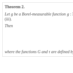 Taking $T\to 1-$ and applying the monotone convergence theorem to both sides of the above identity, we get (11).To remove the additional assumption $g\ge c$, consider the family ${g_{t}^{n}}=g_{t}+1/n$. Then $\langle {g}^{n}\rangle =\langle g\rangle $, ${g}^{n}(x)-{G_{\tau (x)}^{n}}=g(x)-G_{\tau (x)}$, ${g_{t-}^{n}}=g_{t-}+(1/n),{G_{\tau (x)}^{n}}=G_{\tau (x)}+(1/n)$. Hence, we can write (11) for ${g}^{n}$, apply the monotone convergence theorem to both sides of this identity, and get (11) for g. □