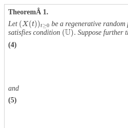 and ${({T_{k}},{\xi _{k}}(\cdot ))_{k\in \mathbb{N}}}$ is a sequence of independent copies of a pair $(T,\xi (\cdot ))$, see, for example, [21, Part II, Chapter 2] and [9, Chapter 11, §8]. The points $({S_{k}})$ are called regeneration epochs and the interval $[{S_{k-1}},{S_{k}})$ is the k-th period of regeneration.For $t\ge 0$, put