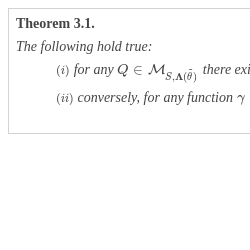 $(ii)$ conversely, for any function $\gamma \in {\mathcal{F}_{P,h}}$ there exists a unique probability measure $Q\in {\mathcal{M}_{S,\boldsymbol{\Lambda }(\widetilde{\theta })}}$ satisfying condition (RRM).