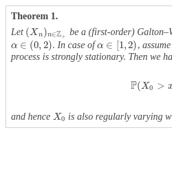 then, by Lemma A.3, ${\textstyle\sum _{j=1}^{\infty }}\mathbb{P}(\varepsilon =j)\log (j)<\infty $. The content of Theorem 2.1.1 in Basrak et al. [4] is the following statement.Theorem 1.