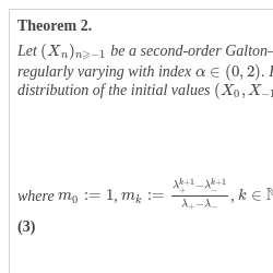 \[ {\lambda _{+}}:=\frac{{m_{\xi }}+\sqrt{{m_{\xi }^{2}}+4{m_{\eta }}}}{2},\hspace{2em}{\lambda _{-}}:=\frac{{m_{\xi }}-\sqrt{{m_{\xi }^{2}}+4{m_{\eta }}}}{2}.\]Note that ${\lambda _{+}}$ and ${\lambda _{-}}$ are the eigenvalues of the offspring mean matrix given in (8) of a corresponding 2-type Galton–Watson process with immigration. Note that for all $k\in {\mathbb{Z}_{+}}$, we have ${m_{k}}=\mathbb{E}({V_{k,0}})$, where ${({V_{n,0}})_{n\geqslant -1}}$ is a second-order Galton–Watson process (without immigration) with the initial values ${V_{0,0}}=1$ and ${V_{-1,0}}=0$, and with the same offspring distributions as ${({X_{n}})_{n\geqslant -1}}$, see (9). Consequently, the series ${\textstyle\sum _{i=0}^{\infty }}{m_{i}^{\alpha }}$ appearing in Theorem 2 is convergent, since for each $i\in \mathbb{N}$, we have ${m_{i}}=\mathbb{E}({V_{i,0}})\leqslant {\lambda _{+}^{i}}<1$ by (10) and the assumption ${m_{\xi }}+{m_{\eta }}<1$.