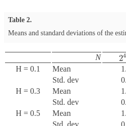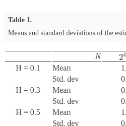 | H = 0.5 | Mean | 1.0051 | 0.9613 | 0.9576 | 0.9883 | 0.9833 | 0.9893 | 0.9915 |