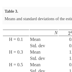 | H = 0.5 | Mean | 1.0695 | 0.9728 | 1.0597 | 1.0671 | 1.0327 | 1.0205 | 1.0079 |