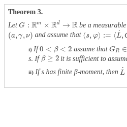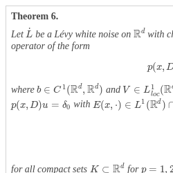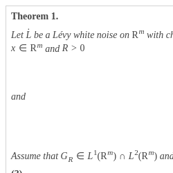 for $n\to \infty $. This gives (5), and (6) follows from (9). Hence $G({\varphi _{n}})\to G(\varphi )$ in $D(\dot{L})$ as $n\to \infty $. □In Theorem 1 we assumed that ${G_{R}}\in {L^{1}}({\mathbb{R}^{m}})\cap {L^{2}}({\mathbb{R}^{m}})$. In the following Proposition we will show that, if a Lévy white noise has no Gaussian part and, for $\beta \in (1,2)$, ${\textstyle\int _{\mathbb{R}}}|r{|^{\beta }}{\mathds{1}_{|r|\le 1}}\nu (dr)<\infty $, then we can assume ${G_{R}}\in {L^{1}}({\mathbb{R}^{m}})\cap {L^{\beta }}({\mathbb{R}^{m}})$ instead.