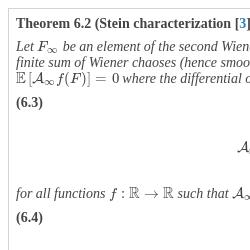 Let ${F_{\infty }}$ be an element of the second Wiener chaos of the form (6.1). Assume that F is a generic centered random variable living in a finite sum of Wiener chaoses (hence smooth in the sense of Malliavin calculus). Then, $F={F_{\infty }}$ (equality in distribution) if and only if $\mathbb{E}\left[{\mathcal{A}_{\infty }}f(F)\right]=0$ where the differential operator ${\mathcal{A}_{\infty }}$ is given by