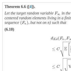 \[ {d_{W}}({F_{n}},{F_{\infty }})\le C\hspace{0.1667em}\sqrt{\Delta ({F_{n}})+1/4\hspace{0.1667em}{\kappa _{3}^{2}}({F_{n}})}\]The next result provides a quantitative bound in the Kolmogorov distance. The proof relies on the classical Berry–Essen estimate in terms of bounding the difference of the characteristic functions. We recall that for two real-valued random variables X and Y the Kolmogorov distance is defined as