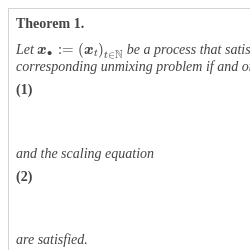 Let ${\boldsymbol{x}_{\text{•}}}:={\left({\boldsymbol{x}_{t}}\right)_{t\in \mathbb{N}}}$ be a process that satisfies Definition 2. The functional $g:\boldsymbol{a}\mapsto \boldsymbol{\Gamma }(\boldsymbol{a}-\boldsymbol{\mu }):{\mathbb{C}^{d}}\to {\mathbb{C}^{d}}$ is a solution to the corresponding unmixing problem if and only if the eigenvector equation