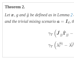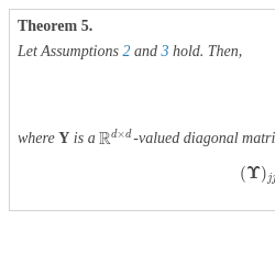 \[\begin{aligned}{}& {\gamma _{T}}\left(\text{diag}\left[\hat{\textbf{J}}\hat{\boldsymbol{\Gamma }}-{\textbf{I}_{d}}\right]\right)={\gamma _{T}}\left(\frac{1}{2}\text{diag}\left[{\hat{\textbf{S}}_{0}}-{\textbf{I}_{d}}\right]\right)+{\mathcal{O}_{p}}(1/{\gamma _{T}}),\\ {} & {\gamma _{T}}\left(\hat{\textbf{J}}\hat{\boldsymbol{\Gamma }}-\text{diag}\left[\hat{\textbf{J}}\hat{\boldsymbol{\Gamma }}\right]\right)={\gamma _{T}}\left(\textbf{H}\odot \left[{\boldsymbol{\Lambda }_{\tau }}{\hat{\textbf{S}}_{0}}-{\hat{\textbf{S}}_{\tau }}\right]\right)+{\mathcal{O}_{p}}(1/{\gamma _{T}}),\end{aligned}\]
