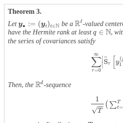 Note that in the one-dimensional setting, the Hermite rank q of a function f is the smallest nonnegative integer in Equation (3), such that ${\alpha _{q}}\ne 0$. We next present the multivariate version of the well-known Breuer–Major theorem from [8].
