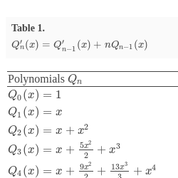 | ${Q_{3}}(x)=x+\frac{5{x^{2}}}{2}+{x^{3}}$ | ${Q^{\prime }_{3}}(x)=1+5x+3{x^{2}}$ |