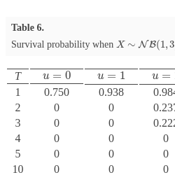 In this section we verify the formulated Theorems 1–6 with some chosen r.vs. That is performed by choosing particular distributions of X and Y and obtaining $\varphi (u,T)$ and $\varphi (u)$ for some $u\in {\mathbb{N}_{0}}$ and $T\in \mathbb{N}$. Initial wealth u and time T are chosen individually aiming to reflect the dynamics of survival probabilities. The presented survival probabilities are calculated with Python [16] and confirmed with Wolfram Mathematica [18]. Results are rounded up to three decimal places except when the rounding result is 0 or 1. As the initial values of the ultimate time survival probability in Theorems 2–4 depend on $n\in \mathbb{N}$, there $n=100$ is chosen as large enough when applying them. Ideally, we should set $n\to \infty $ and, for example, Theorem 4 would imply