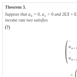 \[\begin{aligned}{}& \left(\begin{array}{c@{\hskip10.0pt}c@{\hskip10.0pt}c}{\alpha _{n+1}}-{\alpha _{n}}& {\beta _{n+1}}-{\beta _{n}}& {\gamma _{n+1}}-{\gamma _{n}}\\ {} {\alpha _{n+2}}-{\alpha _{n}}& {\beta _{n+2}}-{\beta _{n}}& {\gamma _{n+2}}-{\gamma _{n}}\\ {} {\alpha _{n+3}}-{\alpha _{n}}& {\beta _{n+3}}-{\beta _{n}}& {\gamma _{n+3}}-{\gamma _{n}}\end{array}\right)\times \left(\begin{array}{c}\varphi (0)\\ {} \varphi (1)\\ {} \varphi (2)\end{array}\right)\\ {} & +\left(\begin{array}{c}{\delta _{n+1}}-{\delta _{n}}\\ {} {\delta _{n+2}}-{\delta _{n}}\\ {} {\delta _{n+3}}-{\delta _{n}}\end{array}\right)\times (4-2\mathbb{E}X-\mathbb{E}Y)=\left(\begin{array}{c}\varphi (n+1)-\varphi (n)\\ {} \varphi (n+2)-\varphi (n)\\ {} \varphi (n+3)-\varphi (n)\end{array}\right),\hspace{0.1667em}n\in {\mathbb{N}_{0}},\end{aligned}\]