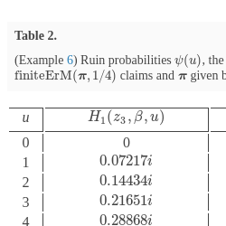 Observe again that the first term ${b_{1}}$ is positive and is much more significant than any of the other entries of b. As ${z_{3}}$ and ${z_{4}}$ are complex conjugates, their associated values ${b_{3,1}}$, ${b_{3,2}}$ and ${b_{4,1}}$, ${b_{4,2}}$ are also complex conjugates, respectively. By Theorem 1, the ruin probability reads