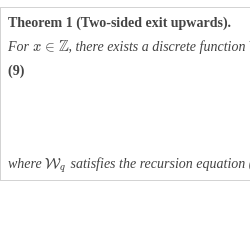 \[\begin{aligned}{}& {c_{L}}{\mathcal{Z}_{q}}\left(x\right)-q{(y+1)^{-1}}{\mathcal{W}_{q}}\left(x,y+1\right)\\ {} & ={\mathbf{1}_{(x=y)}}+{\sum \limits_{k=-1}^{x}}{p_{k+1}}q(x-k)\big[{c_{L}}{\mathcal{Z}_{q}}\left(x-k\right)-q{(y+1)^{-1}}{\mathcal{W}_{q}}\left(x-k,y+1\right)\big]\\ {} & \hspace{2em}+{c_{L}}q(0){\sum \limits_{k=x+1}^{\infty }}{p_{k+1}},\end{aligned}\]