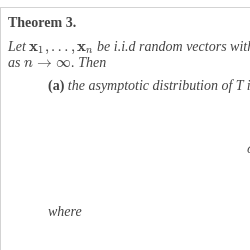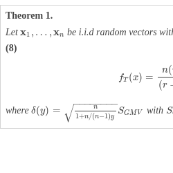 are the sample estimators of $\boldsymbol{\mu }$ and Σ, respectively.The following theorem provides distribution of T under both the null and alternative hypotheses. Note that f subindexed by a distribution stands for the density of that distribution.