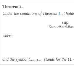 \[ \underset{{V_{GMV}}\gt 0,s\ge 0,{R_{GMV}}\le {r_{f}}}{\sup }{G_{T,\alpha ,{t_{n-r;1-\alpha }}}}\left({S_{GMV}},s\right)\le {\mathbb{P}_{{H_{0}}:{R_{GMV}}={r_{f}}}}\left(T\gt {t_{n-r;1-\alpha }}\right)=\alpha ,\]