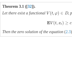 \[ \begin{aligned}{}LV(t,{z_{t}})& =\frac{\partial }{\partial t}{V_{\varphi }}\big(t,z(t)\big)+\nabla {V^{\prime }_{\varphi }}\big(t,z(t)\big)\big(Az(t)-Bx(t-h)\big)\\ {} & \hspace{1em}+\frac{1}{2}{\sum \limits_{i=1}^{2}}{z^{\prime }}(t){C^{\prime }_{i}}{\nabla ^{2}}{V_{\varphi }}\big(t,z(t)\big){C_{i}}z(t).\end{aligned}\]Theorem 3.1 ([32]).