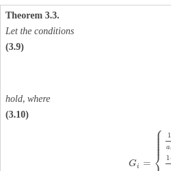 \[ \displaystyle G=\left\{\begin{array}{l@{\hskip10.0pt}l}\frac{b{q^{-1}}\sin (qh)-1}{a+b\cos (qh)},\hspace{1em}& b+|a|\lt 0,\hspace{1em}q=\sqrt{{b^{2}}-{a^{2}}},\\ {} \frac{1+|a|h}{2|a|},\hspace{1em}& b=a\lt 0,\\ {} \frac{b{q^{-1}}\sinh (qh)-1}{a+b\cosh (qh)},\hspace{1em}& a+|b|\lt 0,\hspace{1em}q=\sqrt{{a^{2}}-{b^{2}}}.\end{array}\right.\]Theorem 3.3.