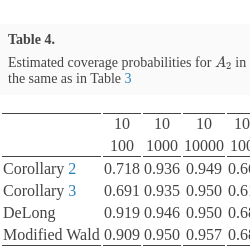 | Modified Wald | 0.4251 | 0.1365 | 0.0432 | 0.2496 | 0.0858 | 0.0272 |