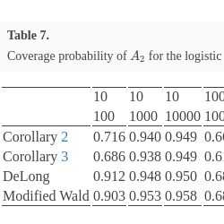 Estimated coverage probabilities for ${A_{2}}$ in the logistic regression model with the first unit vector as true parameter. The further details are the same as in Table 3