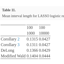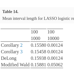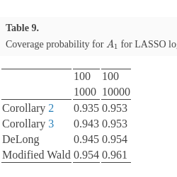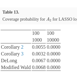 While the theoretical results tell that asymptotically the old confidence intervals work under Model 2 as well, our simulation results tell that at small sample size these confidence intervals may have a seriously too low coverage probability—recall in particular the results in Table 4 for $p=100$. Hence the construction of new confidence intervals is desirable. A tempting idea is to use the δ-method in the same way as we use it in the proof. However, the derivative in Lemma 3 is zero and hence one will end up with the old confidence intervals when using this approach. A solution would be to use the second-order δ-method (see, e.g., [1, Lemma 5]). However, this may appear to be inelegant. The second-order δ-method yields that the limiting distribution of the AUC is a sum of squares of Gaussian random variables, but since not all Gaussian random variables involved in that sum have the same variance, this sum will not be ${\chi ^{2}}$-distributed in general. It is not clear whether a closed-form expression for the variances of these Gaussian random variables can be derived even in the ideal situation when the design points are multivariate-normally distributed or distributed uniformly on the ball. In the realistic situation, when the distribution of the design points is unknown and has to be estimated, it will even be a challenge to propose an algorithm that gives a reasonable approximation for these variances in acceptable time. The results for the LASSO logistic regression ranged from providing a satisfactory solution to being even worse than the pure logistic regression depending on the unknown true model parameter. Bootstrap [3] is known to have good finite-sample properties in many instances and hence would be another approach worth trying. Finally, our simulations in Table 16 show that the estimator $\hat{A}$ is seriously biased for ${A_{2}}$. Hence one can think of constructing an estimator for the bias of $\hat{A}$ for ${A_{2}}$ and then applying bias reduction.