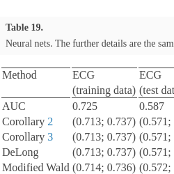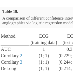The results are reported in Table 17. Though strictly speaking outside the scope of this article, we added the results for the training group. In order to see how the confidence intervals behave on a smaller sample, we applied our methods to a subsample consisting of 100 coronary angiographies. The results are shown in Table 18.