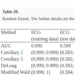 | DeLong | (0.999; 0.999) | (0.583; 0.615) | (1; 1) | (0.556; 0.588) |
