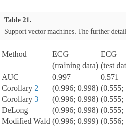 In Tables 19–21 we look what happens, when one uses neural nets, random forests or support vector machines instead of logistic regression models. We see that the confidence intervals are slightly shifted due to the different values of the point estimates, but that they all have approximately the same length as the confidence intervals of the logistic regression model.