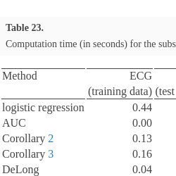 For the whole sample all confidence intervals have approximately the same length—the new intervals have the same length as the ones from the literature and the intervals based on the ECGs have the same length as the ones based on the seven risk factors. Not surprisingly, as we reduce the number of observations, the intervals get longer. In particular, for all 13,538 coronary angiographies the logistic regression model is significantly better than a pure random choice (i.e. an AUC of 0.5), which is no longer true if we use only 100 coronary angiographies. For the subsample the new confidence intervals are slightly narrower than the ones from the literature.