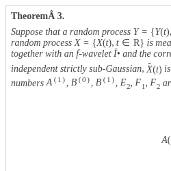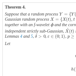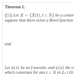 ([13]) Let $X=\{X(t),t\in \mathbb{R}\}$ be a centered stochastic process satisfying the requirements of Theorem 1, $T>0$, ϕ be an f-wavelet, ψ be the corresponding m-wavelet, $S(y)=\overline{\hat{\psi }(y)}$, $S_{\phi }(y)=\overline{\hat{\phi }(y)}$. Suppose that $\phi (y),u(t,\lambda )$, $S(y)$, $S_{\phi }(y)$ satisfy the following conditions: the function $u(t,y)$ is absolutely continuous with respect to y, the function $\hat{\phi }(y)$ is absolutely continuous,