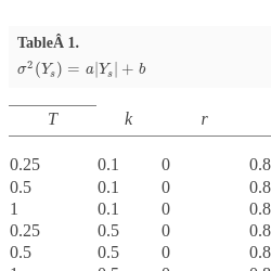 | T | α | r | K | a | b | $\hat{\mathbb{E}}\hat{P}_{m}$ | $\mathbb{E}V$ | $\hat{\mathbb{E}}\hat{P}_{m}$ | $\mathbb{E}V$ |