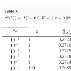 | $\Delta t$ | α | $\hat{\mathbb{E}}{\bar{\sigma }_{m}^{2}}$ | ${\bar{d}_{1}^{(m)}}$ | ${\bar{d}_{2}^{(m)}}$ | $\hat{\mathbb{E}}\hat{P}_{m}$ |