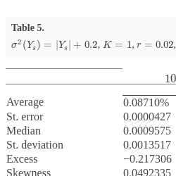 ${\sigma }^{2}(Y_{s})=|Y_{s}|+0.2$, $K=1$, $r=0.02$, $k=0.1$, $T=1$. Characteristics of sample of errors