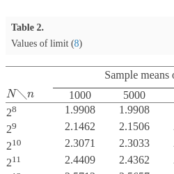As we see, with increasing sample size 20 times, the sample means differ at most by 0.33% for each N. Therefore, to ensure the accuracy of calculations, it suffices to put $n=1000$. Under such conditions, technical resources allow us to calculate the sample means for larger values of N. In Table 3, the values of the sample means are presented for $N=\{{2}^{20},{2}^{21},{2}^{22},{2}^{23},{2}^{24},{2}^{25}\}$ .