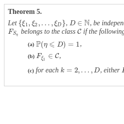 Let $\{X_{1},X_{2},\dots ,X_{n}\},n\in \mathbb{N}$, be independent real-valued r.v.s. Then the d.f. $F_{\varSigma _{n}}$ of the sum $\varSigma _{n}=X_{1}+X_{2}+\cdots +X_{n}$ belongs to the class $\mathcal{C}$ if the following conditions are satisfied: