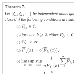 (e) $\underset{x\to \infty }{\limsup }\underset{n\geqslant 1}{\sup }\displaystyle\frac{1}{n\overline{F}_{\xi _{1}}(x)}{\displaystyle\sum \limits_{i=1}^{n}}\overline{F}_{\xi _{i}}(x)\leqslant 1$,