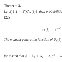 \[\begin{array}{r@{\hskip0pt}l}\displaystyle E{e}^{\theta S_{\mathit{II}}(t)}& \displaystyle =\frac{{\lambda }^{2}}{(\lambda +\lambda _{1}(1-{e}^{-\theta }))(\lambda +\lambda _{2}(1-{e}^{\theta }))\hspace{0.1667em}}\\{} & \displaystyle \hspace{1em}\times \exp \bigg(-\beta t\frac{\lambda _{1}(1-{e}^{-\theta })}{\lambda +\lambda _{1}(1-{e}^{-\theta })\hspace{0.1667em}}\bigg)\exp \bigg(-\beta t\frac{\lambda _{2}(1-{e}^{\theta })}{\lambda +\lambda _{2}(1-{e}^{\theta })\hspace{0.1667em}}\bigg)\end{array}\]