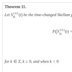 \[\begin{array}{r@{\hskip0pt}l}\displaystyle P\big(S_{\mathit{II}}(t)=k\big)& \displaystyle ={e}^{-2\beta t}\frac{{\lambda }^{2}{\lambda _{2}^{|k|}}}{(\lambda _{1}+\lambda ){(\lambda _{2}+\lambda )}^{|k|+1}}\sum \limits_{n=0}^{\infty }\frac{{(\lambda _{1}\lambda _{2})}^{n}(n+k+1)(n+1)}{{(\lambda _{1}+\lambda )}^{n}{(\lambda _{2}+\lambda )}^{n}}\\{} & \displaystyle \hspace{1em}\times \hspace{0.1667em}{\mathcal{E}_{1,1}^{n+1}}\bigg(\frac{\lambda \beta t}{\lambda _{1}+\beta }\bigg){\mathcal{E}_{1,1}^{n+|k|+1}}\bigg(\frac{\lambda \beta t}{\lambda _{2}+\beta }\bigg).\end{array}\]