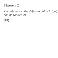 where $\| \cdot \| $ denotes the total variation. Specifically, with $({\varOmega }^{-},{\varOmega }^{+})$ denoting a Hahn decomposition of Ω, let $({\nu }^{-},{\nu }^{+})$ be the Jordan decomposition of ν. Note that ${\nu }^{-}$ and ${\nu }^{+}$ are elements of ${\mathcal{M}}^{+}$. The variation of ν is $|\nu |={\nu }^{-}+{\nu }^{+}$, and its total variation is $\| \nu \| =|\nu |(\varOmega )$. The following theorem provides an actionable, and crucial for our considerations, reformulation of the index $\mathrm{LOP}(\nu )$.Proof.