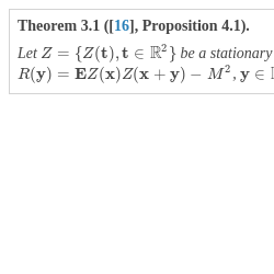 The proof of the equality (2) can be found in the paper [7]. All we need to do is to prove that the field Z is ergodic. Let’s check the conditions of Theorem 3.1. The covariance function R is continuous and bounded, and can be represented as follows: