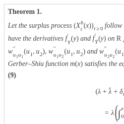 \[ \begin{array}{r@{\hskip0pt}l}& \displaystyle (\lambda +\bar{\lambda }+\delta _{0})m(x)\\{} & \displaystyle \hspace{1em}=\lambda \Bigg({\int _{0}^{x}}m(u)f_{Y}(x-u)\hspace{0.1667em}\mathrm{d}u+{\int _{0}^{\infty }}w(x,u)f_{Y}(x+u)\hspace{0.1667em}\mathrm{d}u\Bigg)\\{} & \displaystyle \hspace{2em}+\frac{\lambda \theta (\bar{\lambda }+\delta _{0})}{2\lambda +\bar{\lambda }+\delta _{0}}\Bigg({\int _{0}^{x}}m(u)h_{Y}(x-u)\hspace{0.1667em}\mathrm{d}u+{\int _{0}^{\infty }}w(x,u)h_{Y}(x+u)\hspace{0.1667em}\mathrm{d}u\Bigg)\\{} & \displaystyle \hspace{2em}+\bar{\lambda }{\int _{x}^{\infty }}m(u)f_{\bar{Y}}(u-x)\hspace{0.1667em}\mathrm{d}u+\frac{\bar{\lambda }\bar{\theta }(\lambda +\delta _{0})}{\lambda +2\bar{\lambda }+\delta _{0}}\hspace{0.1667em}{\int _{x}^{\infty }}m(u)h_{\bar{Y}}(u-x)\hspace{0.1667em}\mathrm{d}u,\\{} & \displaystyle \hspace{2em}\hspace{2em}\hspace{2em}\hspace{2em}\hspace{2em}\hspace{2em}\hspace{2em}\hspace{2em}\hspace{2em}\hspace{2em}\hspace{2em}\hspace{2em}\hspace{2em}x\in [0,\infty ).\end{array}\]Remark 3.