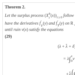 \[ \begin{array}{r@{\hskip0pt}l}& \displaystyle {d}^{2}{m^{\prime\prime\prime }_{2}}(x)+(3\lambda +2\bar{\lambda }+2\delta _{0})d{m^{\prime\prime }_{2}}(x)+(2\lambda +\bar{\lambda }+\delta _{0})(\lambda +\bar{\lambda }+\delta _{0}){m^{\prime }_{2}}(x)\\{} & \displaystyle \hspace{1em}=-\frac{2\bar{\lambda }(\bar{\lambda }-\lambda )(\lambda +2\bar{\lambda }+\delta _{0})}{{d}^{2}}\hspace{0.1667em}{e}^{-(\lambda +2\bar{\lambda }+\delta _{0})x/d}\hspace{0.1667em}I_{3}(x)\\{} & \displaystyle \hspace{2em}-\frac{\bar{\lambda }(\bar{\lambda }-\lambda )(\lambda +2\bar{\lambda }+\delta _{0})}{d}\hspace{0.1667em}I_{6}(x)+(2\lambda +\bar{\lambda }+\delta _{0}){\beta ^{\prime }_{1}}(x)+d{\beta ^{\prime\prime }_{1}}(x)\\{} & \displaystyle \hspace{2em}-2{\beta ^{\prime }_{2}}(x)+\frac{2{\bar{\lambda }}^{2}\bar{\theta }(\bar{\lambda }-\lambda )}{d}\hspace{0.1667em}{\int _{0}^{\infty }}m_{2}(x+y)h_{\bar{Y}}(y)\hspace{0.1667em}\mathrm{d}y,\hspace{1em}x\in [b,\infty ).\end{array}\]Remark 1.