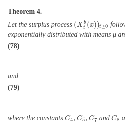 Thus, since $\Delta _{2}\ne 0$, the system of equations (80)–(83) has a unique solution. Furthermore, note that letting $x=b$ in (76) gives no additional information about unknown constants, but the equality in (76) holds for the values of the constants found from the system of equations (80)–(83). Therefore, each of differential equations (70) and (71) has the unique solution given by (78) or (79), respectively. Since we have derived these equations from (68) and (69) without any additional assumptions, we conclude that the functions $\psi _{1}(x)$ and $\psi _{2}(x)$ given by (78) and (79) are unique solutions to (68) and (69) satisfying the certain conditions. This guaranties that the functions $\psi _{1}(x)$ and $\psi _{2}(x)$ we have found coincide with the ruin probability on the intervals $[0,b]$ and $[b,\infty )$, respectively, which completes the proof. □