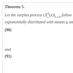 Let the surplus process $({X_{t}^{b}}(x))_{t\ge 0}$ follow (6) under the above assumptions with $\theta =0$ and $\bar{\theta }=0$, and let claim and premium sizes be exponentially distributed with means μ and $\bar{\mu }$, respectively, and let $\bar{\lambda }\bar{\mu }>\lambda \mu +d$ and $\mathrm{D}_{4}>0$. Then we have