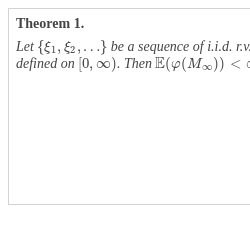 Sgibnev [30] generalized results by Kiefer and Wolfowitz [21] obtaining the upper bound for the submultiplicative moment $\mathbb{E}(\varphi ({M_{\infty }}))$ in the case of independent and identically distributed (i.i.d.) r.v.’s. In Theorem 2 of that paper, the following assertion is proved.